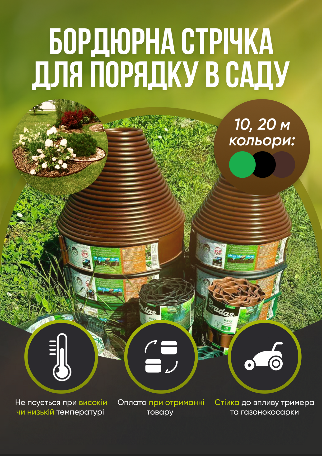 Матеріал міцний, гнучкий. Дуже сподобалось, нарешті моя клумба виглядає охайно. Рекомендую продавця!